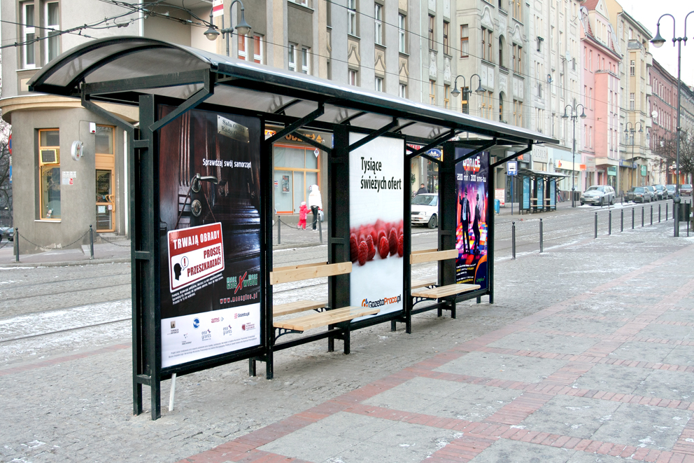 - Opis nośnik najbliższy odbiorcy: plakat umieszczony jest na wysokości oczu, a długi czas kontaktu z reklamą pozwala na umieszczenie większej ilości informacji. Nośnik ten najczęściej występuje w wiatach przystankowych.